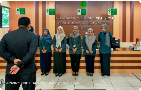 BATANG — Rabu, 18 Februari 2026, Pengadilan Agama Batang kembali melaksanakan briefing pagi rutin yang dijadwalkan secara bergantian bagi petugas Pelayanan Terpadu Satu Pintu (PTSP) dan petugas Pos Bantuan Hukum (Posbakum) dari LBH Fasya UIN K.H. Abdurrahman Wahid Pekalongan yang bertugas di Pengadilan Agama Batang. Kegiatan ini dilaksanakan di ruang PTSP sebelum jam operasional pelayanan dimulai.